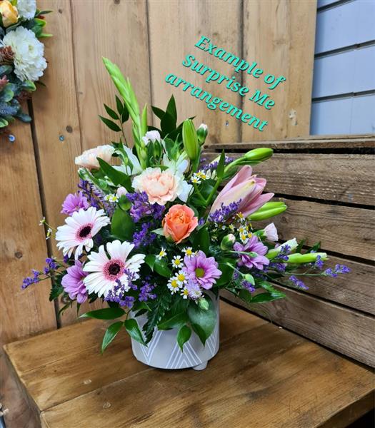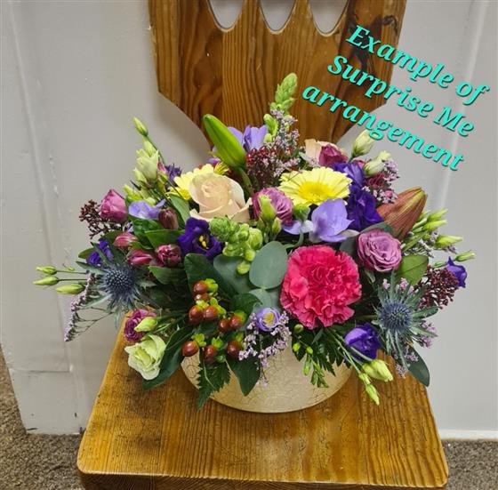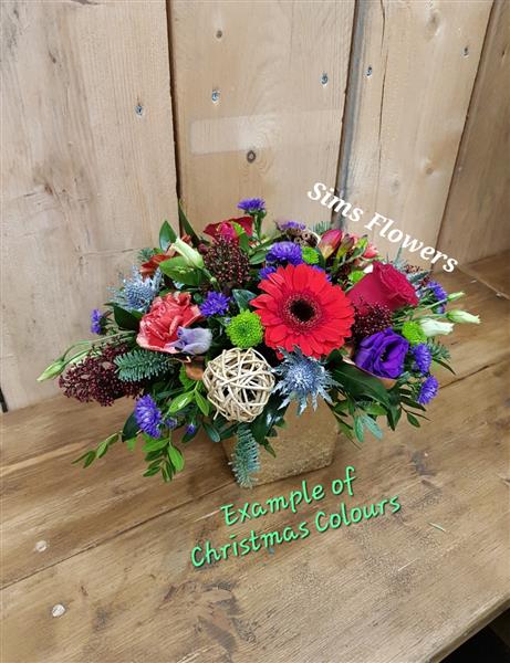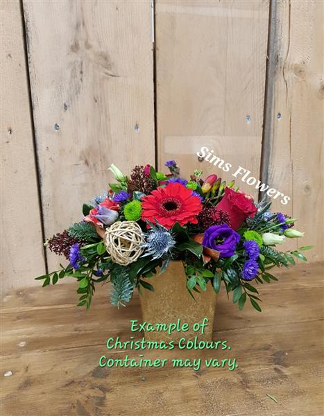 Florist choice flowers in your chosen theme, arranged in floral foam in a gold or red ceramic container for the Christmas colours or a none Christmas colour container for the surprise me colours.
