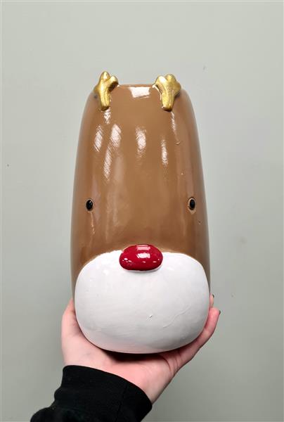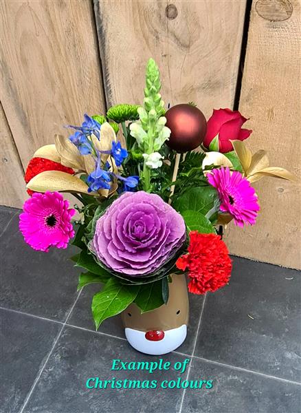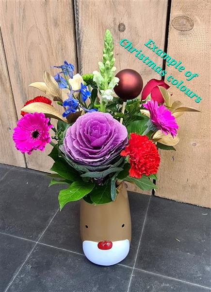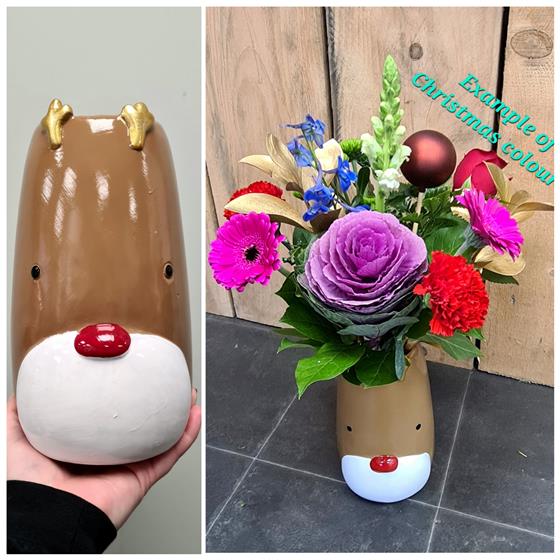 Florist choice flowers arranged in this festive Rudolph vase.